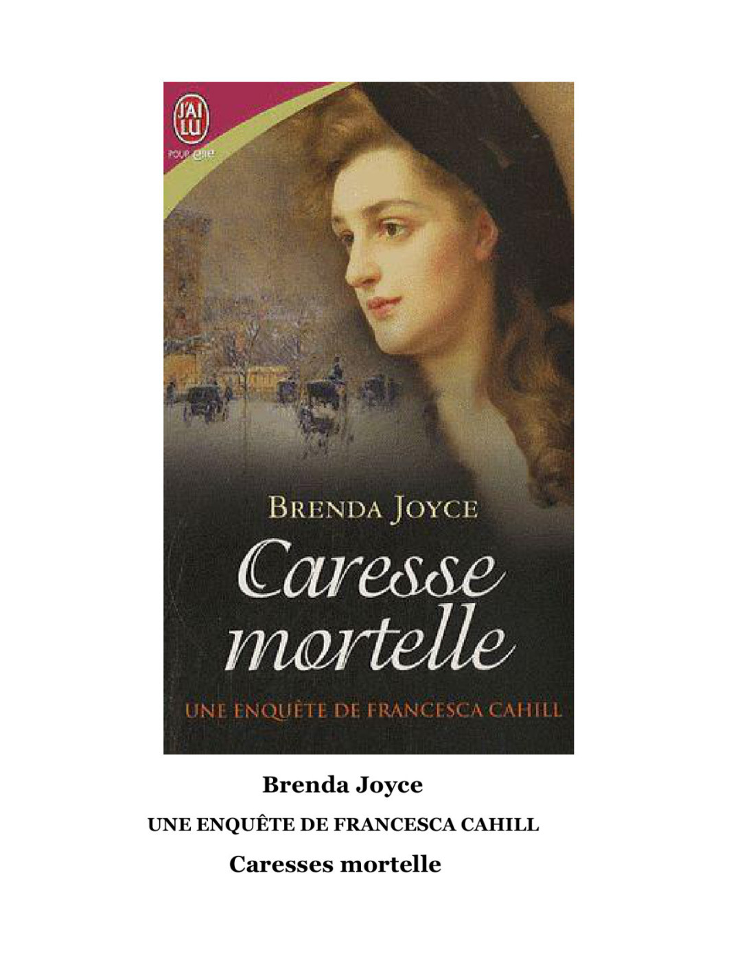 Malgré sa mère qui n'a pas perdu espoir de la voir faire un beau mariage, Francesca Cahill n'en a pas fini avec les enquêtes criminelles. L'atelier d'une jeune artiste peintre a été saccagé, exactement comme celui de son amie Sarah Channing. Cette fois, le vandale a été jusqu'à tuer : le corps de Grace Conway, une jeune actrice, a été retrouvé sur les lieux. Entre ces deux affaires, un seul point commun : Evan, le frère de Francesca, qui a été le fiancé de Sarah et l'amant de Grace. Il est donc le premier suspect. Afin de l'innocenter, la détective en jupon se lance sur la piste de l'Etrangleur, sans l'aide du préfet de police Rick Bragg qu'il lui est interdit d'aimer au grand jour...